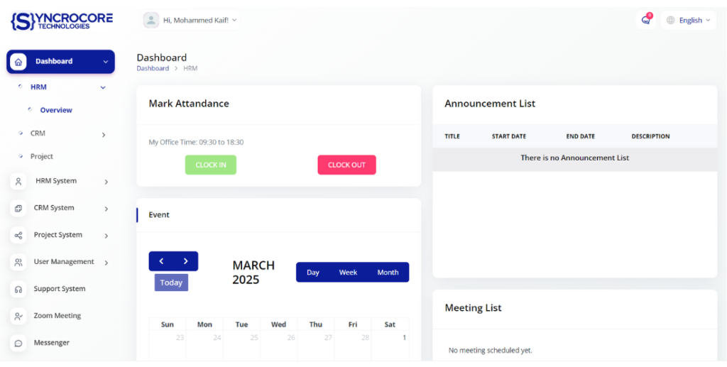SyncroCore ERP is a powerful, all-in-one business management solution designed to enhance efficiency and streamline operations. Our integrated CRM system helps businesses manage leads, track sales, and foster strong customer relationships, ensuring seamless engagement and retention. The HRM module simplifies workforce management by automating payroll, performance tracking, and employee administration, allowing businesses to focus on growth and productivity. Additionally, our advanced Accounting System provides real-time financial tracking and insightful reporting, empowering businesses to make informed decisions with confidence. With SyncroCore ERP, organizations can optimize their processes, boost productivity, and drive success in an increasingly competitive landscape.